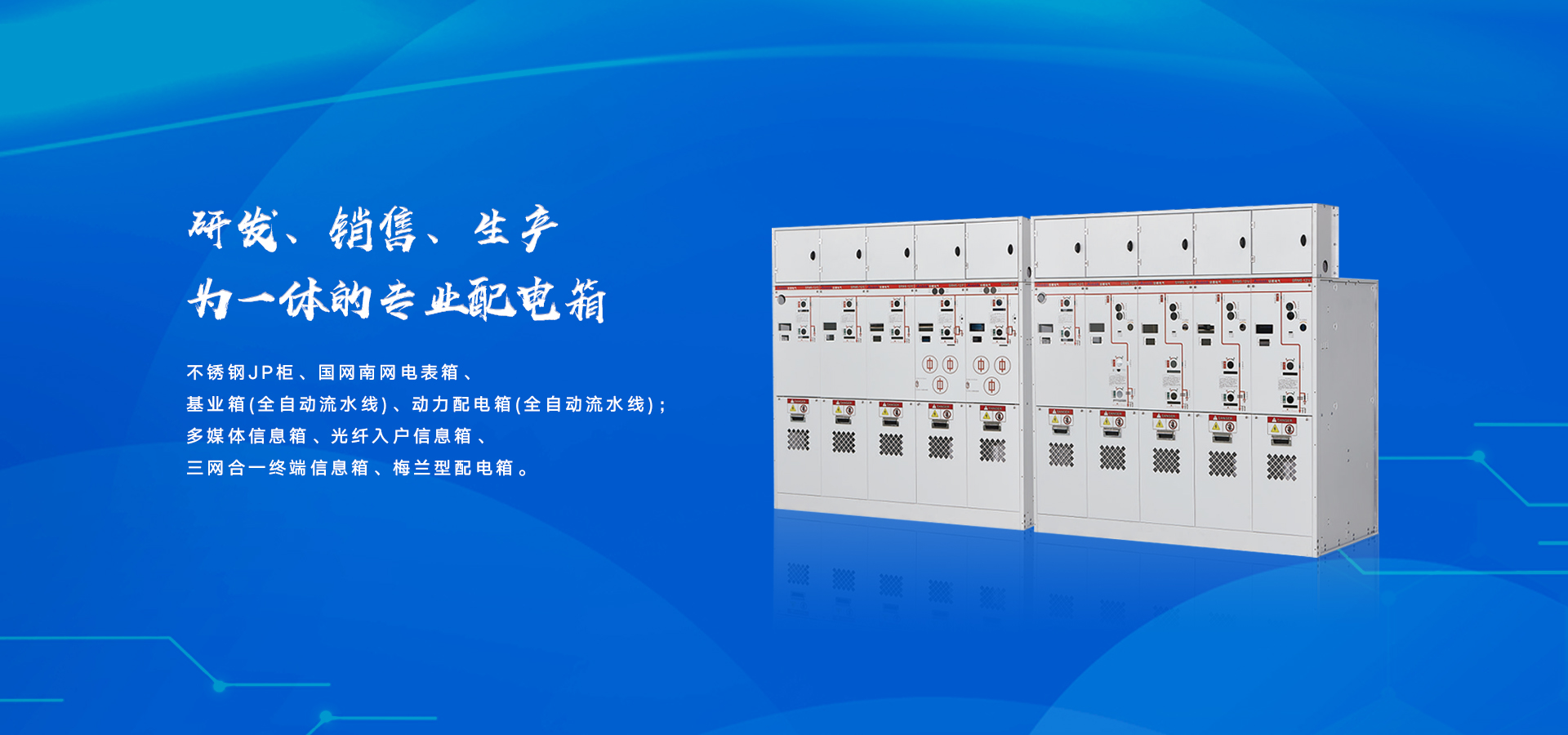 公司的核心產(chǎn)品為不銹鋼JP柜、國(guó)網(wǎng)南網(wǎng)電表箱、基業(yè)箱(全自動(dòng)流水線(xiàn))、動(dòng)力配電箱(全自動(dòng)流水線(xiàn))、多媒體信息箱、光纖入戶(hù)信息箱、三網(wǎng)合一終端信息箱、梅蘭型配電箱、等電位端子箱和非標(biāo)定制箱等;現(xiàn)于多家知名品牌,房產(chǎn)公司、電力公司、成套廠(chǎng)家深度合作,并贏(yíng)得了合作方和終端用戶(hù)的一致好評(píng)!